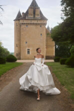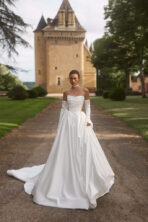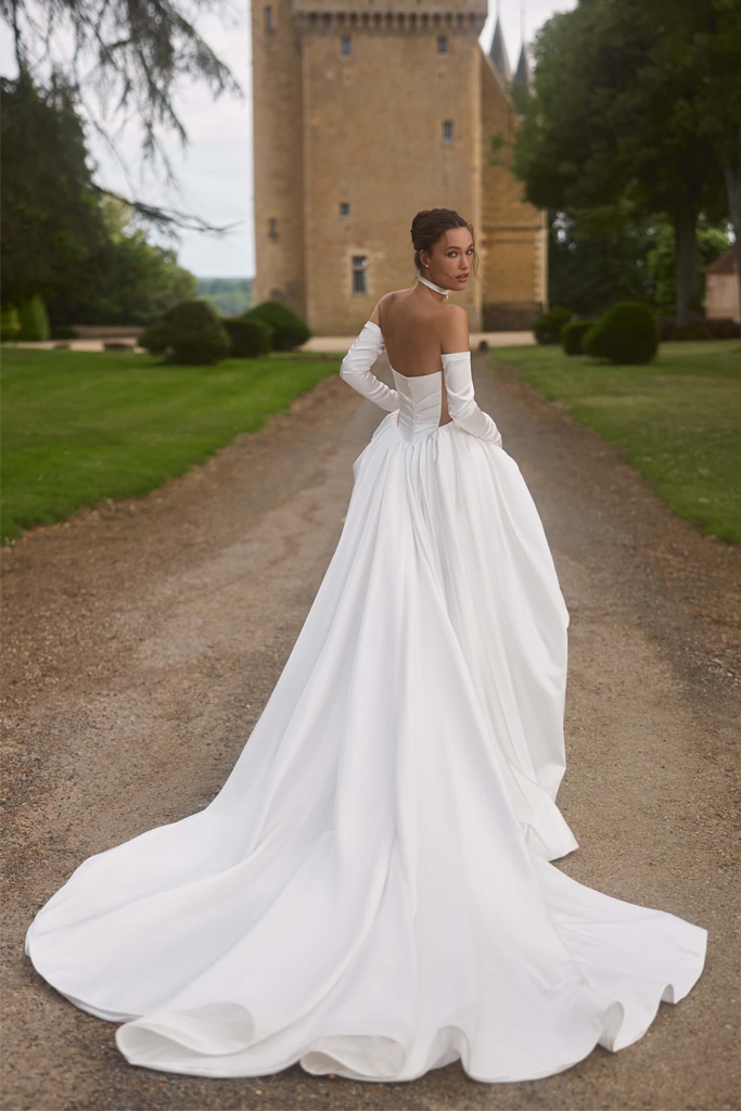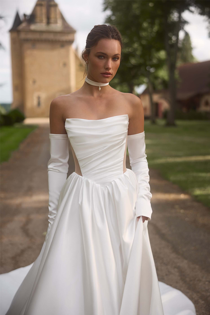 Elegante vestido de novia de silueta princesa confeccionado en satén ligero con un delicado brillo. Su escote strapless con corpiño drapeado estiliza la figura, mientras que los paneles laterales semitransparentes aportan un toque moderno y refinado. La falda amplia con pliegues crea movimiento y volumen, culminando en una elegante cola. El look se completa con guantes a juego, que aportan un aire contemporáneo y sofisticado.
