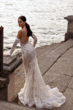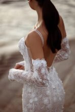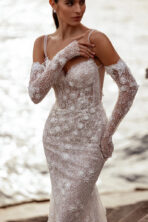 Sofisticado y delicado vestido de novia sirena, confeccionado en encaje chantilly con mostacilla y flores en 3D que aportan textura y un brillo sutil. Cuenta con un corpiño estructurado con copas realza la figura con delicadeza, tirantes que dan soporte y una espalda descubierta que revela sensualidad, mientras que los guantes de encaje añaden un aire elegante y contemporáneo.