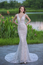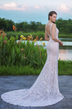 Encantador vestido de novia sirena, sutil escote profundo en delantero, cuenta con un delicado encaje blanco y un cinturón en pedrería que enfatiza la cintura.