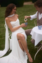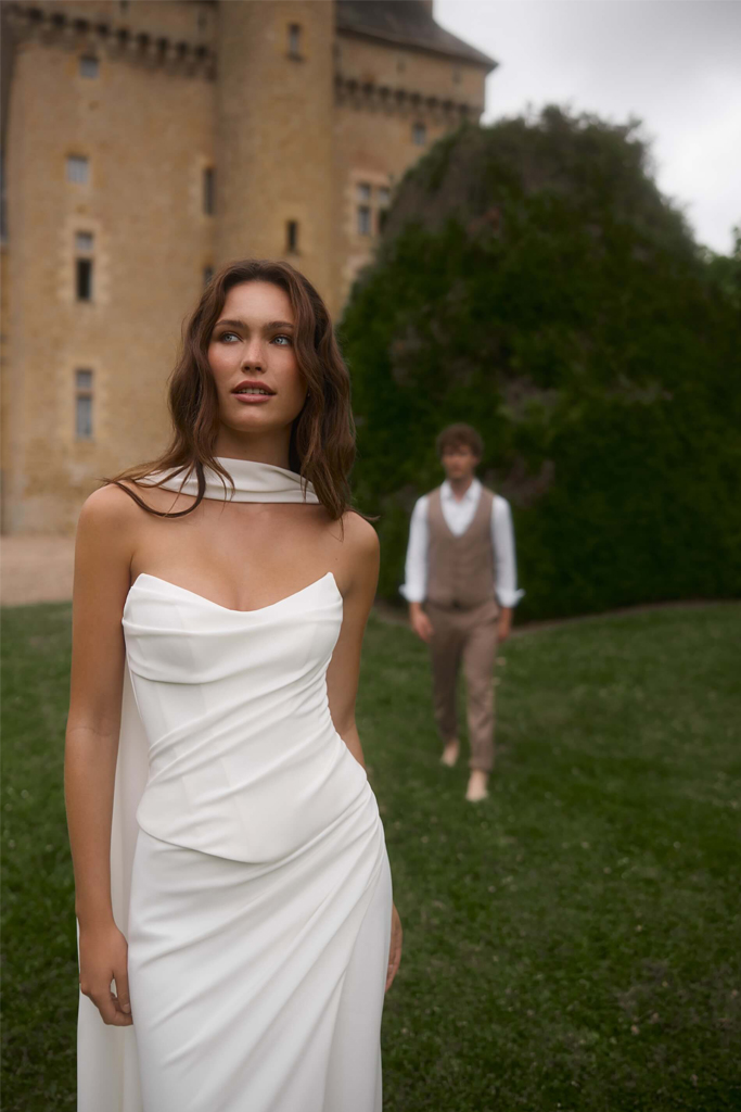 Moderno y sofisticado vestido de novia sirena de dos piezas, confeccionado en crepé suave y fluido que realza la figura con delicadeza. Su corsé estructurado se complementa con una falda de caída envolvente y una abertura frontal que aporta movimiento y un toque de sensualidad sutil. La elegante gargantilla que cae añade un aire etéreo y contemporáneo al look. La falda se prolonga en una discreta cola con forma sirena suave, ideal para la novia que busca un estilo minimalista, actual y lleno de elegancia.