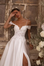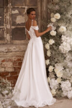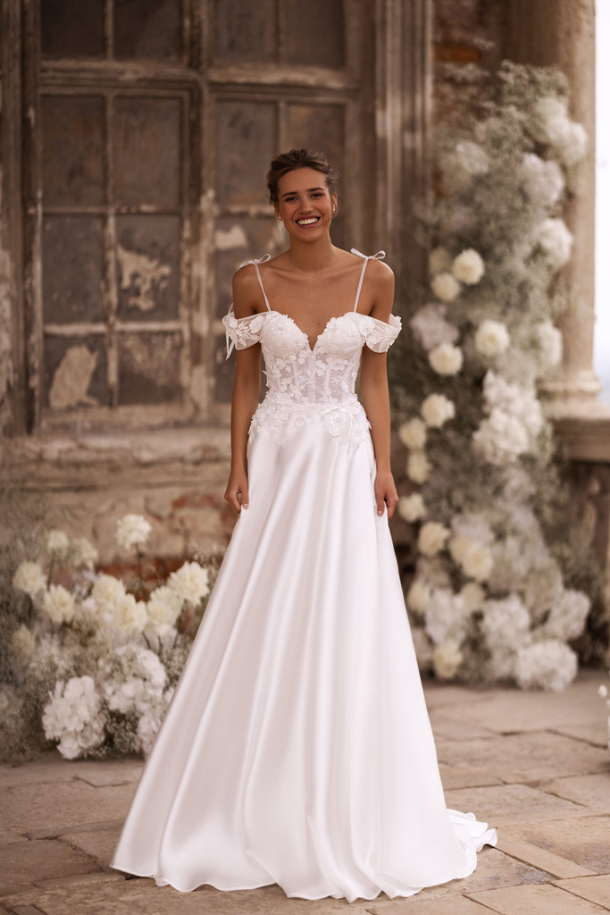 Romántico y delicado vestido de novia línea A, confeccionado en satén suave que aporta una caída fluida y elegante. Su corpiño estructurado con aplicaciones florales y una manga caída acompaña el diseño de manera armoniosa.