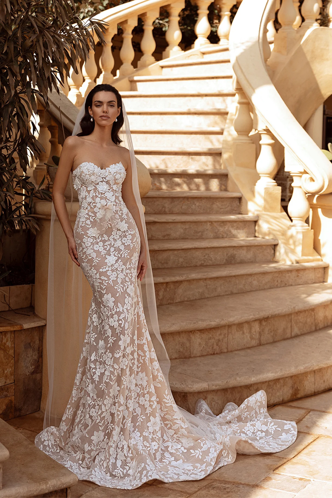 Romántico vestido de novia sirena que realza la figura con una silueta ajustada y femenina. Su escote strapless en forma de corazón resalta el busto y estiliza el torso con elegancia. Confeccionado en encaje floral sobre base nude, incorpora un sutil brillo que ilumina cada movimiento. La falda se abre suavemente desde las rodillas, aportando fluidez y un aire sensual y delicado.