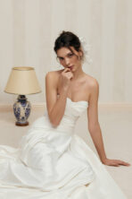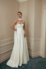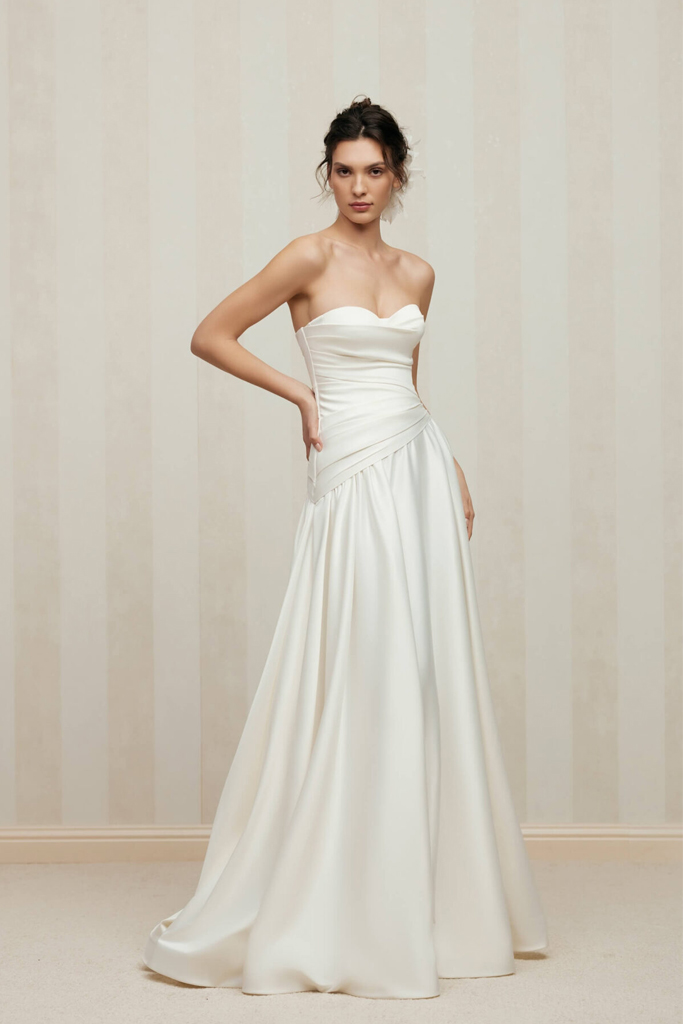 Elegante y atemporal vestido de novia línea A, confeccionado en satén suave que aporta una caída fluida y un brillo delicado. Su corpiño estructurado con copas y drapeado envolvente realza la figura con sutileza, mientras que la falda con pliegues ligeros aporta movimiento y ligereza.