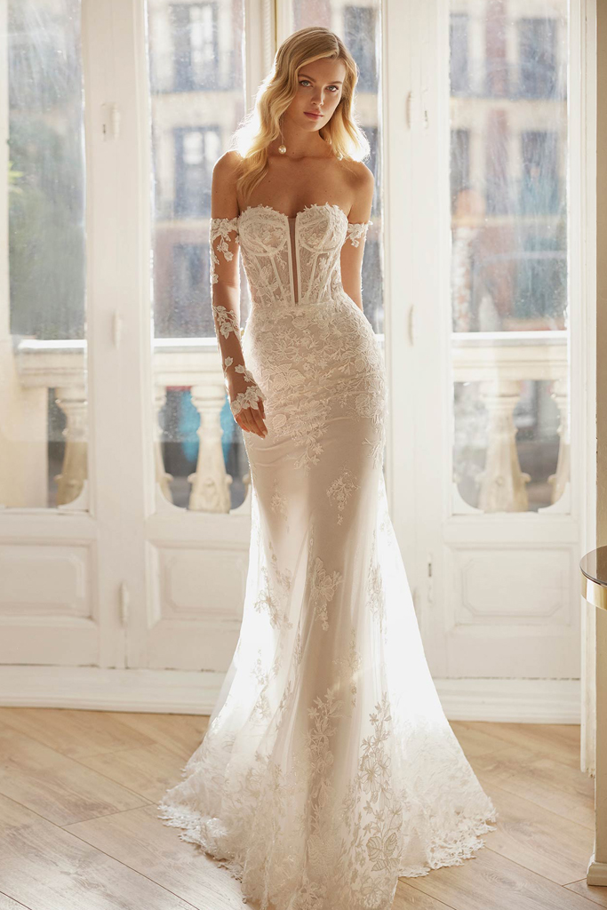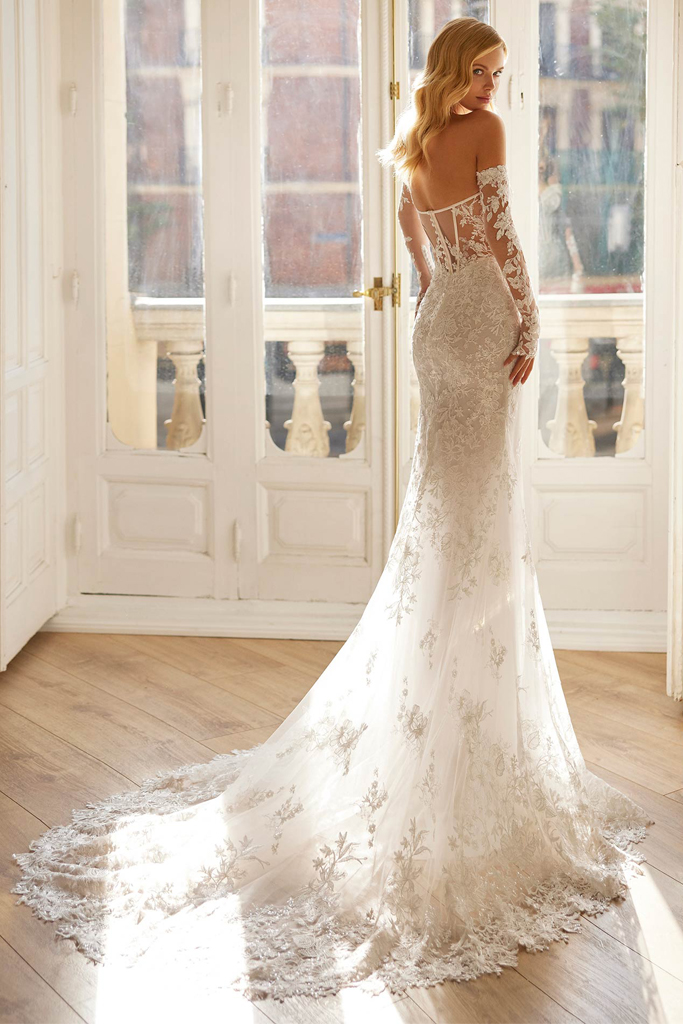Seductor vestido de novia de silueta sirena confeccionado en delicado tul con bordados que aportan un brillo sutil y elegante. Su escote profundo realza el busto con feminidad, mientras que el corset estructurado estiliza la figura con precisión. El diseño se completa con mangas extraíbles en tul bordado y una espalda cerrada que aporta equilibrio y sofisticación.