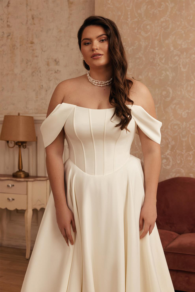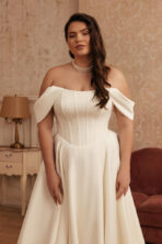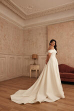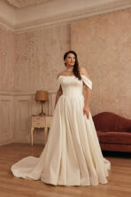Clásico y romántico vestido de novia linea A. Un strapless tipo palabra de honor que está diseñado para resaltar la feminidad con sutileza. Su corsé estructurado de corte vasco moldea la figura con delicadeza, aportando soporte y definición a la cintura. La falda amplia con caída fluye con elegancia, creando un movimiento etéreo que evoca sofisticación y pureza. Las suaves mangas caídas enmarcan los hombros con un aire dulce y romántico, ideal para una novia que busca equilibrio entre lo tradicional y lo moderno. Su confección en mikado mate realza cada paso hacia el altar.