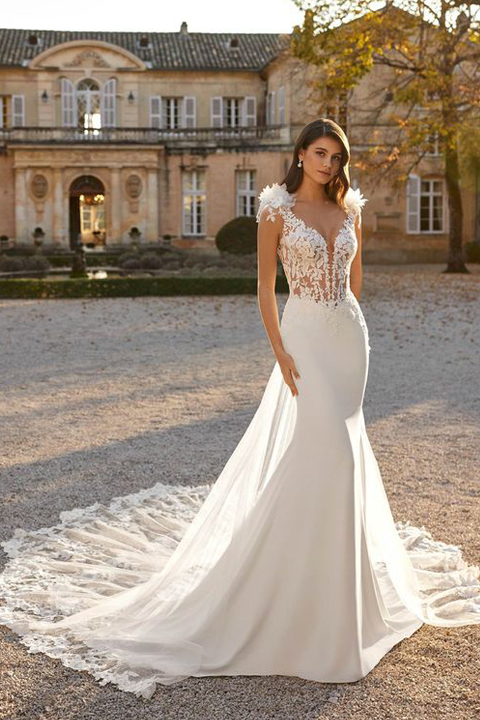 Encantador vestido de novia sirena en crepé, con un cuerpo corsé estructurado adornado en delicado encaje y pedrería que realza la parte superior con romanticismo y brillo sutil. Su escote profundo estiliza la figura, mientras las mangas desmontables permiten un doble look entre moderno y etéreo.